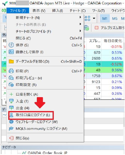MT5の左上の「ファイル」をクリック→メニューの「取引口座にログイン」をクリックしてポップアップした画面にログイン情報を入力します。