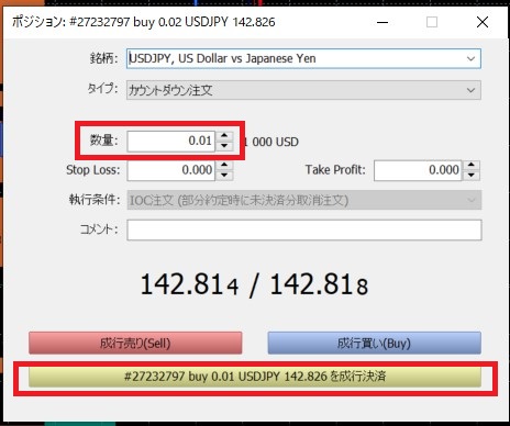2. 発注画面が出てくるので、決済したい数量に変更する。下の「成行決済」のボタンに表示されている数量も間違いがないか確認して、決済ボタンをクリック。