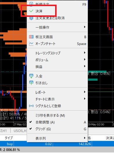 1. MT5下ツールボックス内「取引」のタブから、部分決済したいポジションの上で右クリックして「決済」を選ぶ
