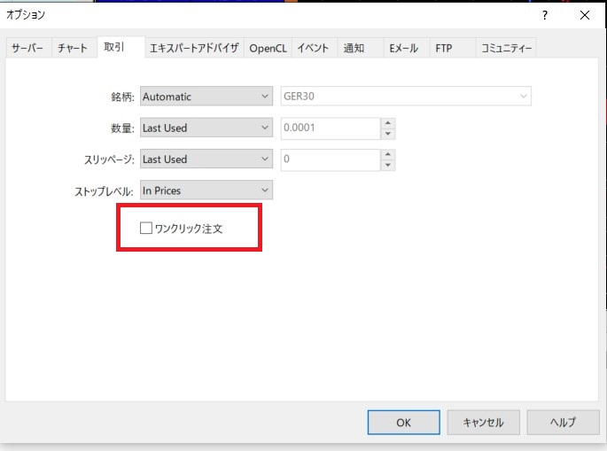 ワンクリック取引にチェックが入っている→ワンクリック取引が有効