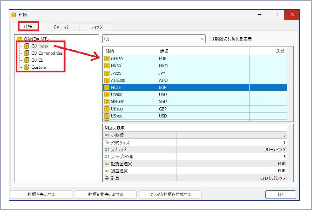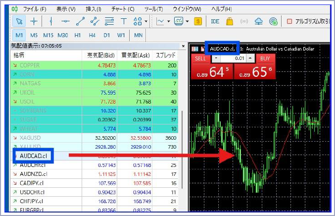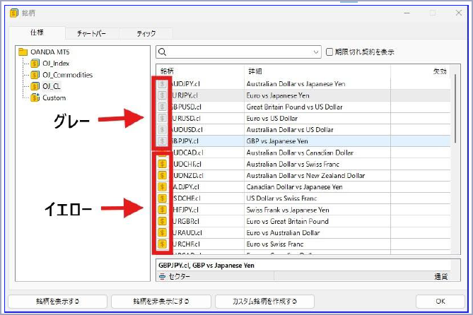PCのMT5で必要な通貨ペアや商品銘柄を設定・表示する方法は下記を確認ください。