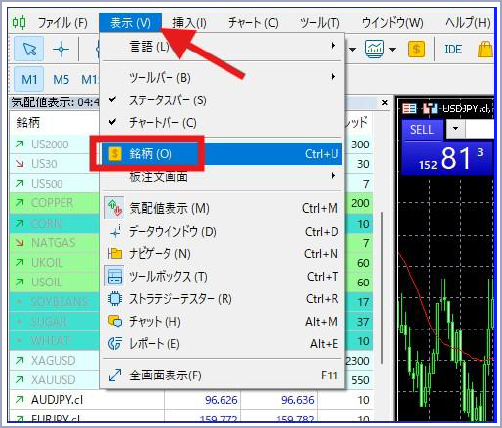 1)MT5(MT4)画画面左上の「表示」を選択して「銘柄」を選択