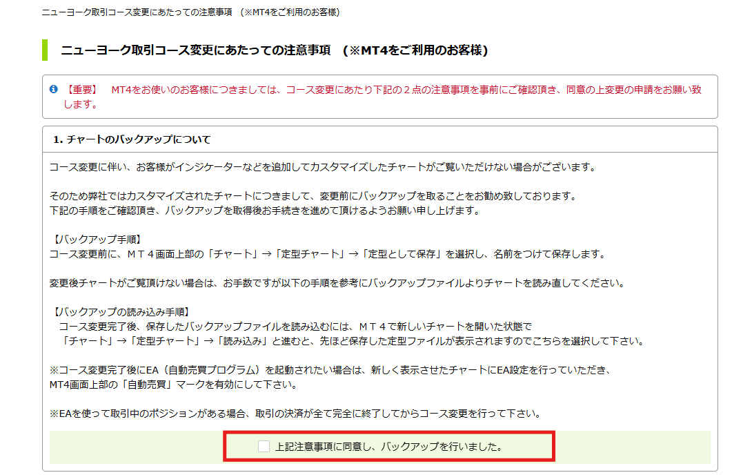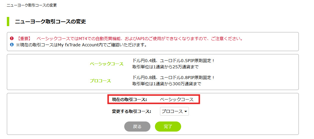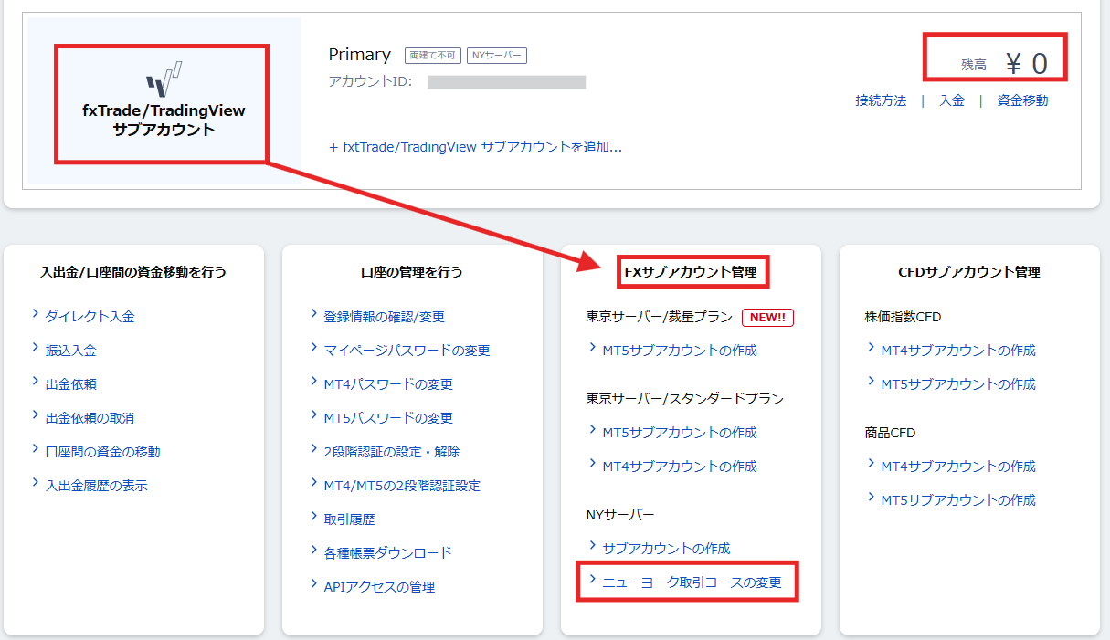 マイページログイン後、FXサブアカウント管理>NYサーバー>ニューヨーク取引コースの変更をクリックしてください。