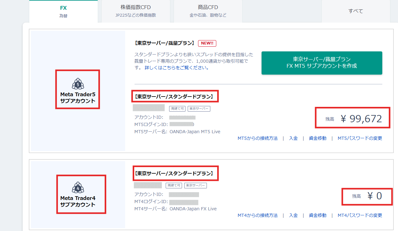 MT4・MT5ともに残高が表示されているアカウントが、現在ご利用中のアカウントです。