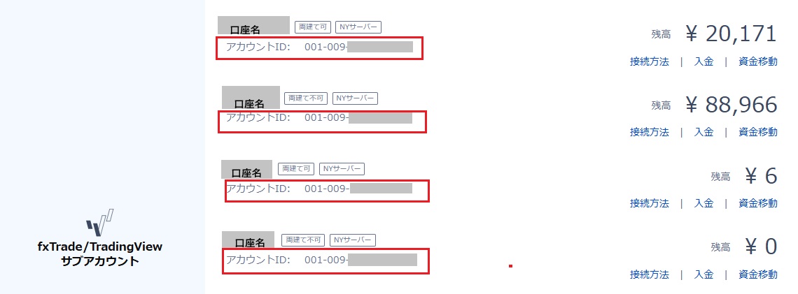 APIを利用する際のアカウントIDは、マイページ内「サブアカウント一覧」>「fxTrade/ Trading Viewサブアカウント」に記載されている「001」から始まる番号です。