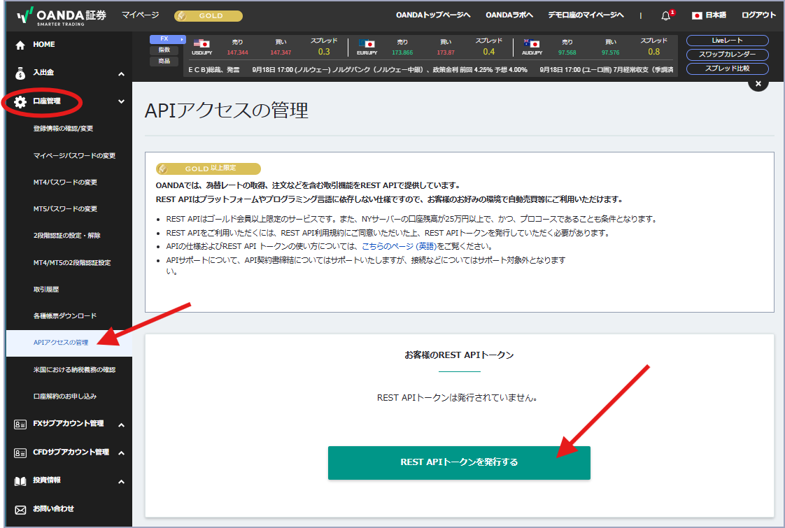 ログイン後、メニュー「口座管理」▶「APIアクセスの管理」を選択 ▶「REST APIトークンを発行する」