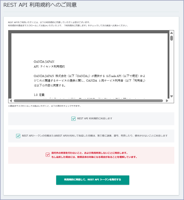 「利用規約に同意して、REST APIトークンを発行する」のボタンをクリック