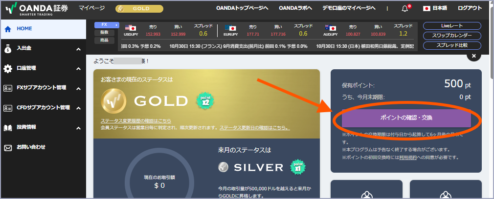 2)マイページ右手の「ポイントの確認・交換」をクリック