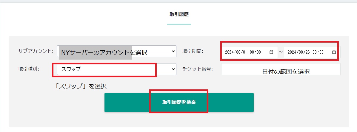 取引履歴でNYサーバーのアカウントを選択、日付の範囲を選び「スワップ」を選ぶと、指定した範囲で獲得したスワップが表示されます。